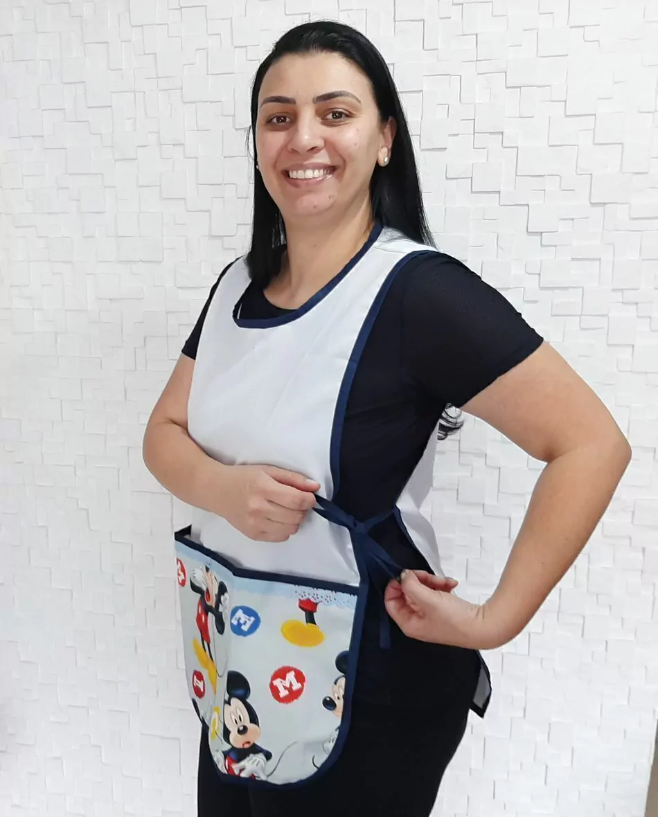 Feito em *tecido Oxford* de alta qualidade, nosso avental bata na cor *branca* é perfeito para quem busca praticidade e estilo. O *super bolso estampado* com temática educacional adiciona um toque único à peça.