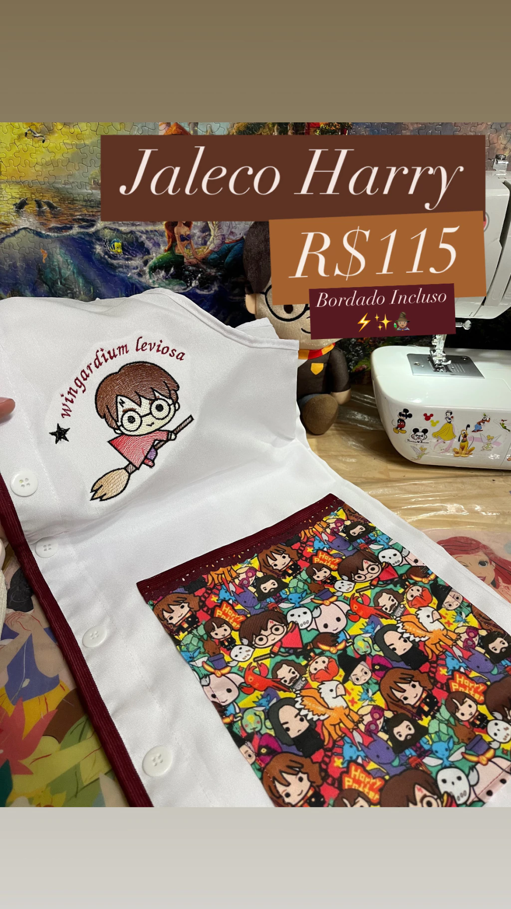 A peça acompanha o bordado do personagem e a famosa frase "Winguardium Leviosa", que acrescenta um charme especial ao seu visual. Para personalizar ainda mais, não deixe de visitar a categoria SERVIÇO DE BORDADO e adicione o seu NOME + PROFISSÃO!